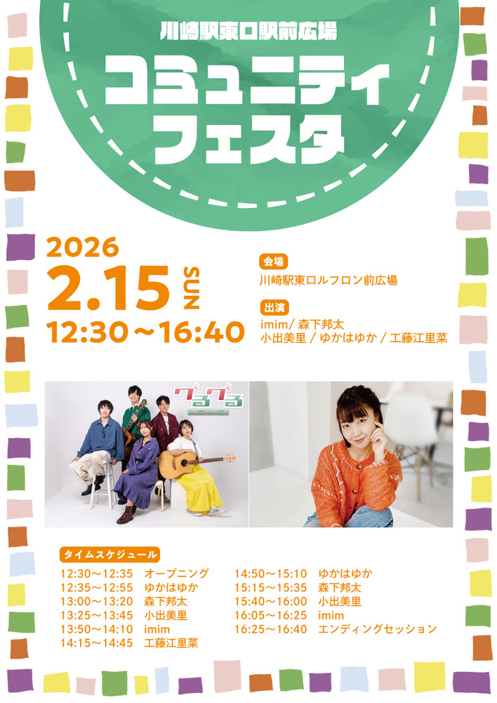 コミュニティフェスタ SCHEDULE 2026/02/15(日) 2026/2/15(日)「コミュニティフェスタ」場所:川崎駅東口 駅前広場(ルフロン前広場)時間:12:30〜出演:imim/森下邦太/小出美里/ゆかはゆか/工藤江里菜※観覧無料 雨天中止 URLをコピーする 報告する